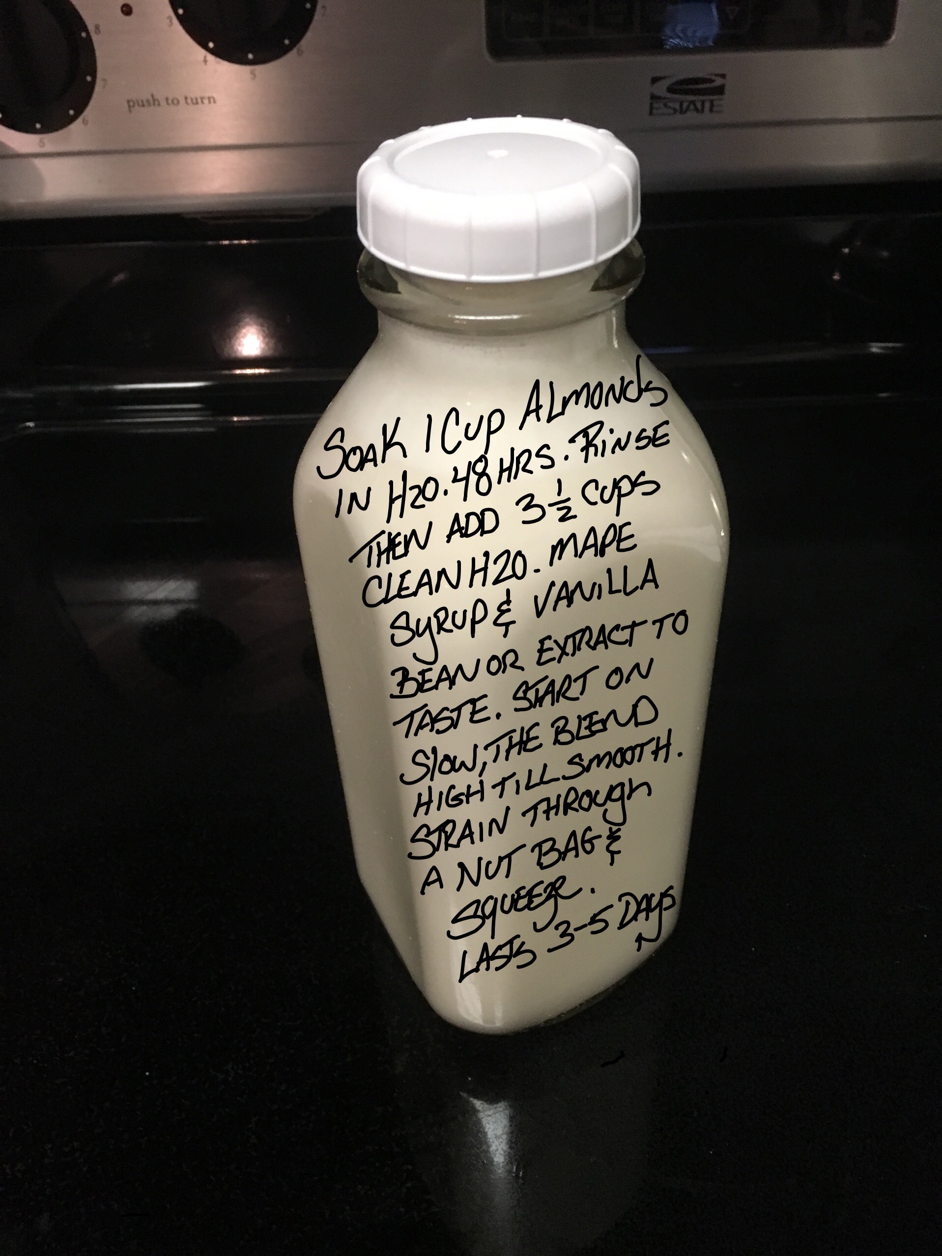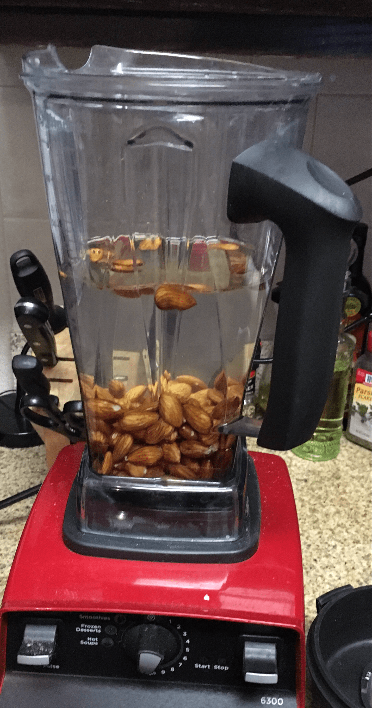 I use filtered water and raw organic almonds. - Start the blender on slow for 10-15 seconds and gradually increase to high speed , until you see all the small partials disappear .