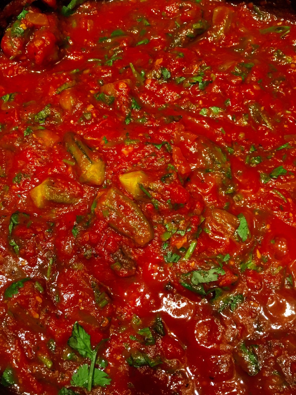 Start with onions and garlic , add large can of crushed tomatoes and 3 oz of tomato paste . Simmer for 5 minutes then add other ingredients and reserve all of the cilantro till last 10 minutes . This dish took 30 – 40 minutes.