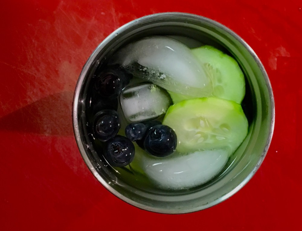 I added cucumber and blueberries. Fruit gives it a subtle flavor. Still experimenting with the fruit combinations, more on this later.