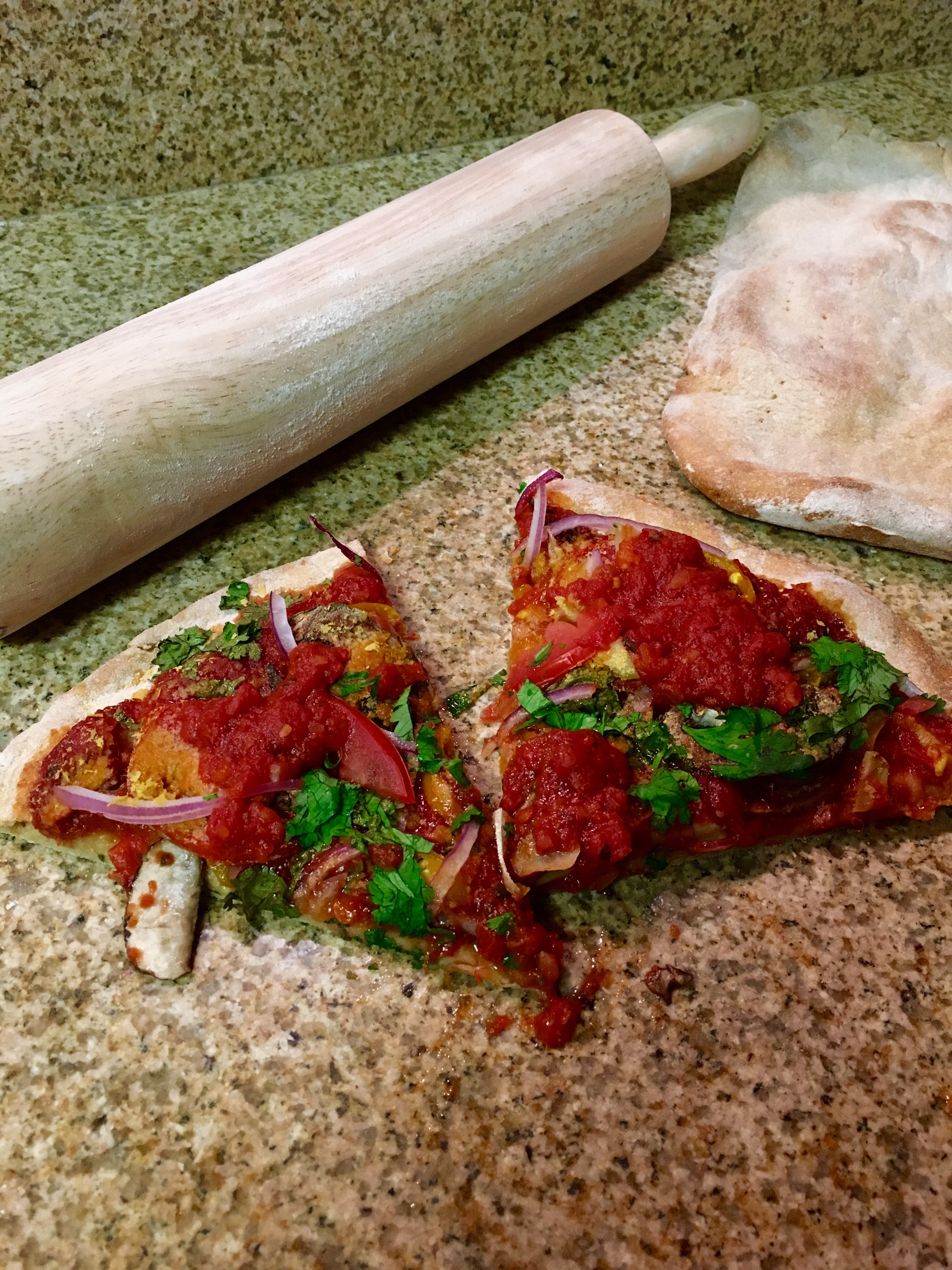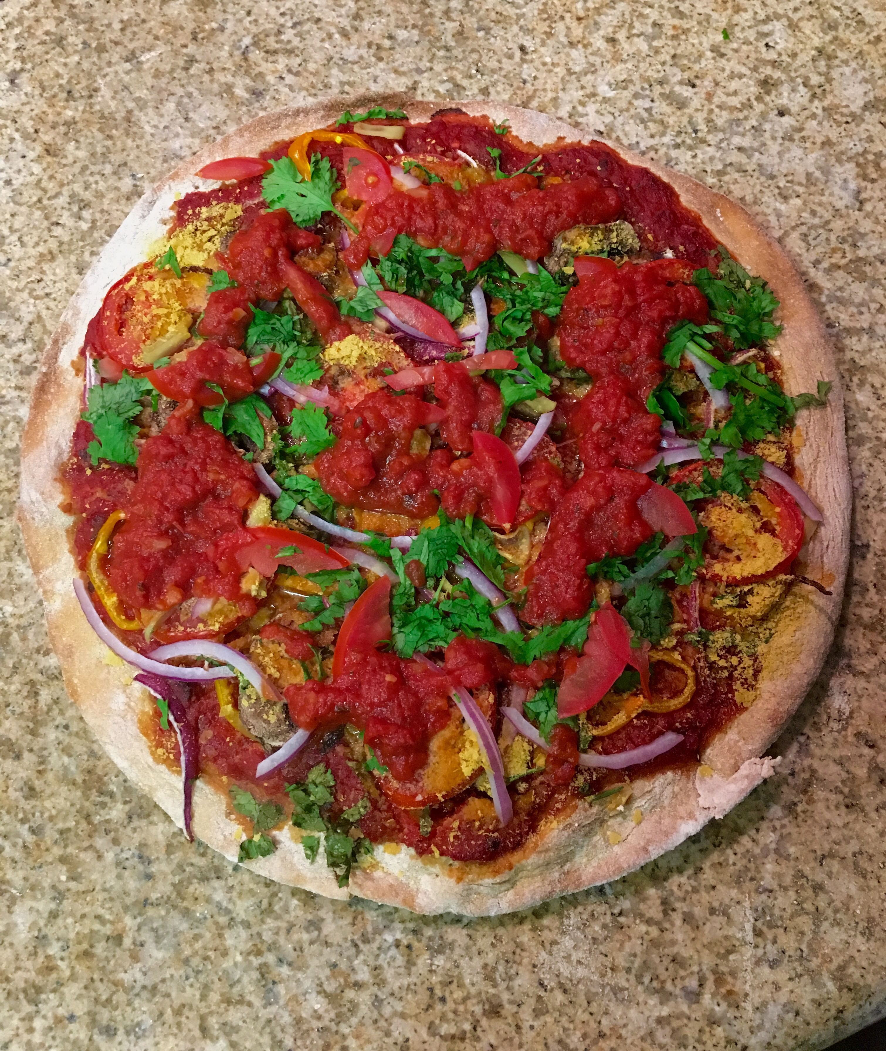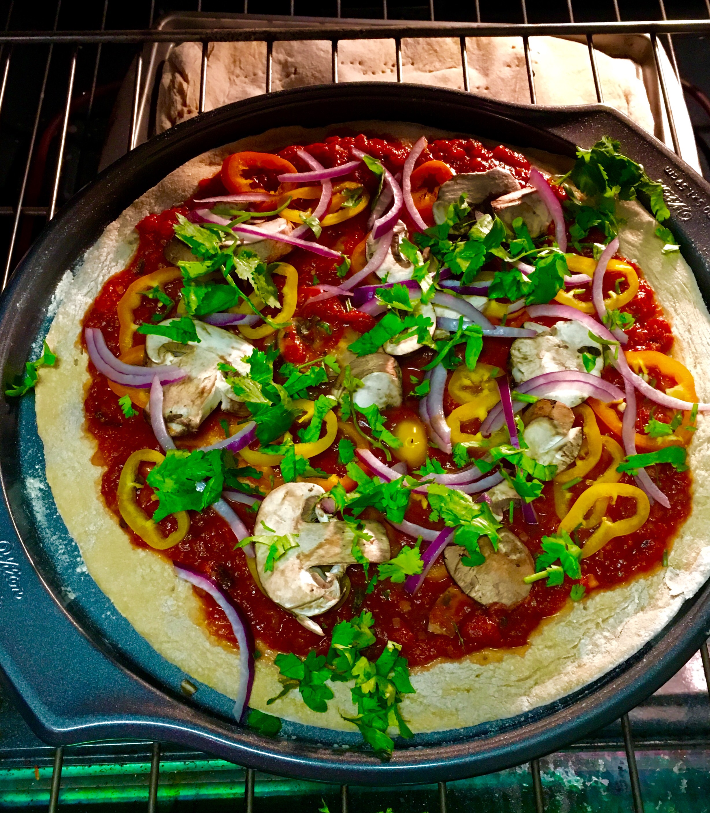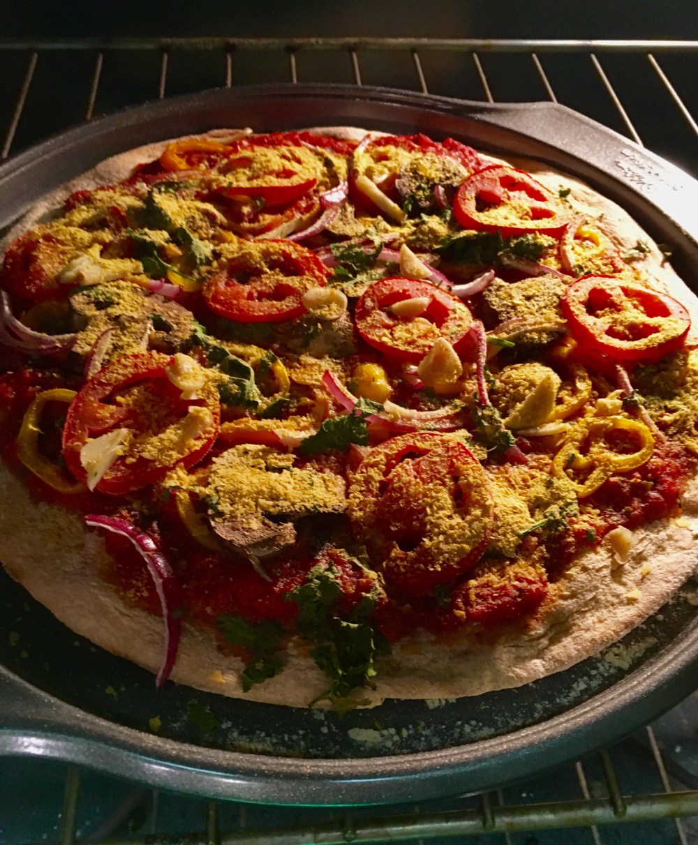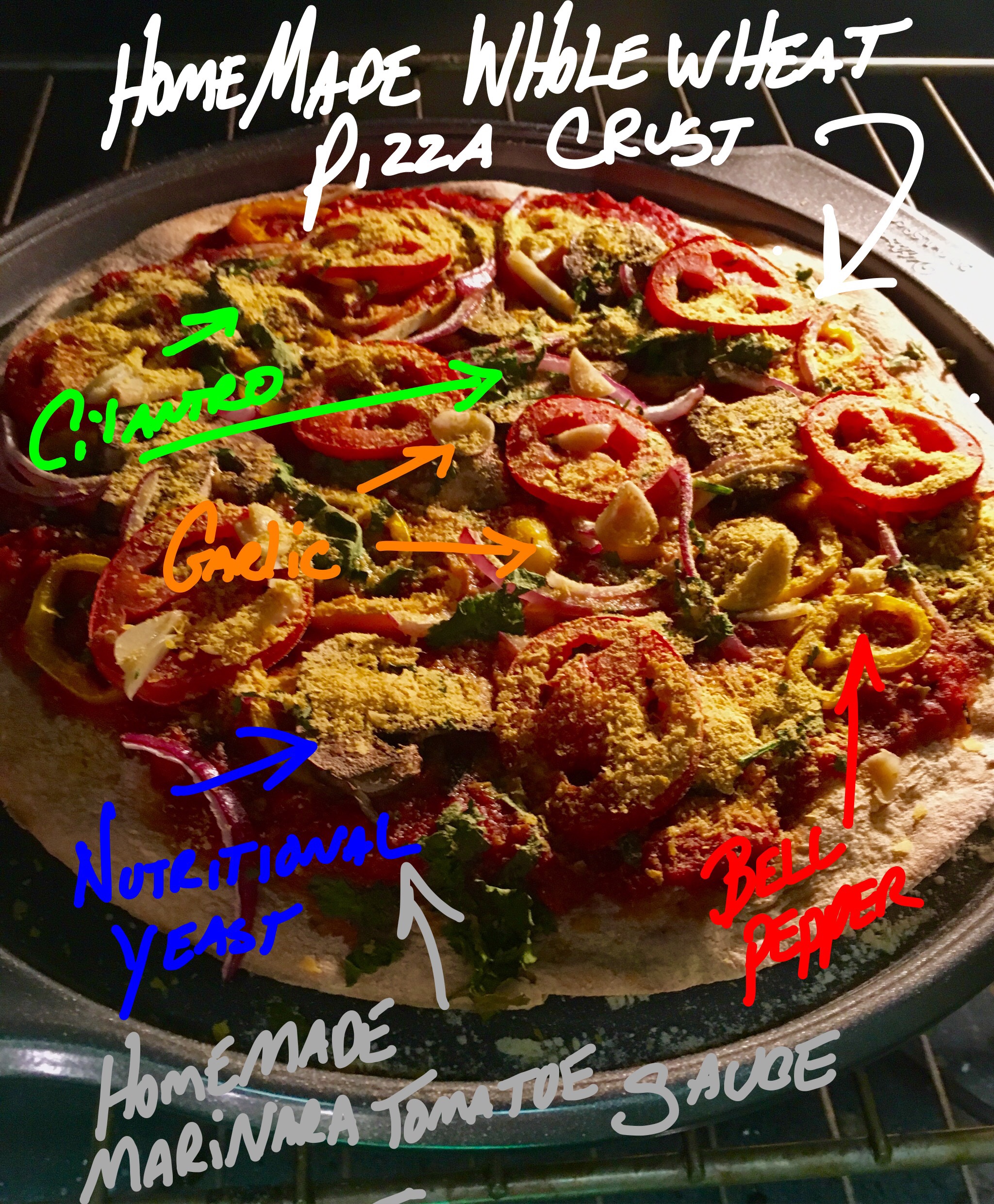 Put your favorite toppings , I made a thick go made marinara , with mushroom peppers and onions and fresh garlic, topped with Roma tomatoes and nutritional yeast. And cilantro .