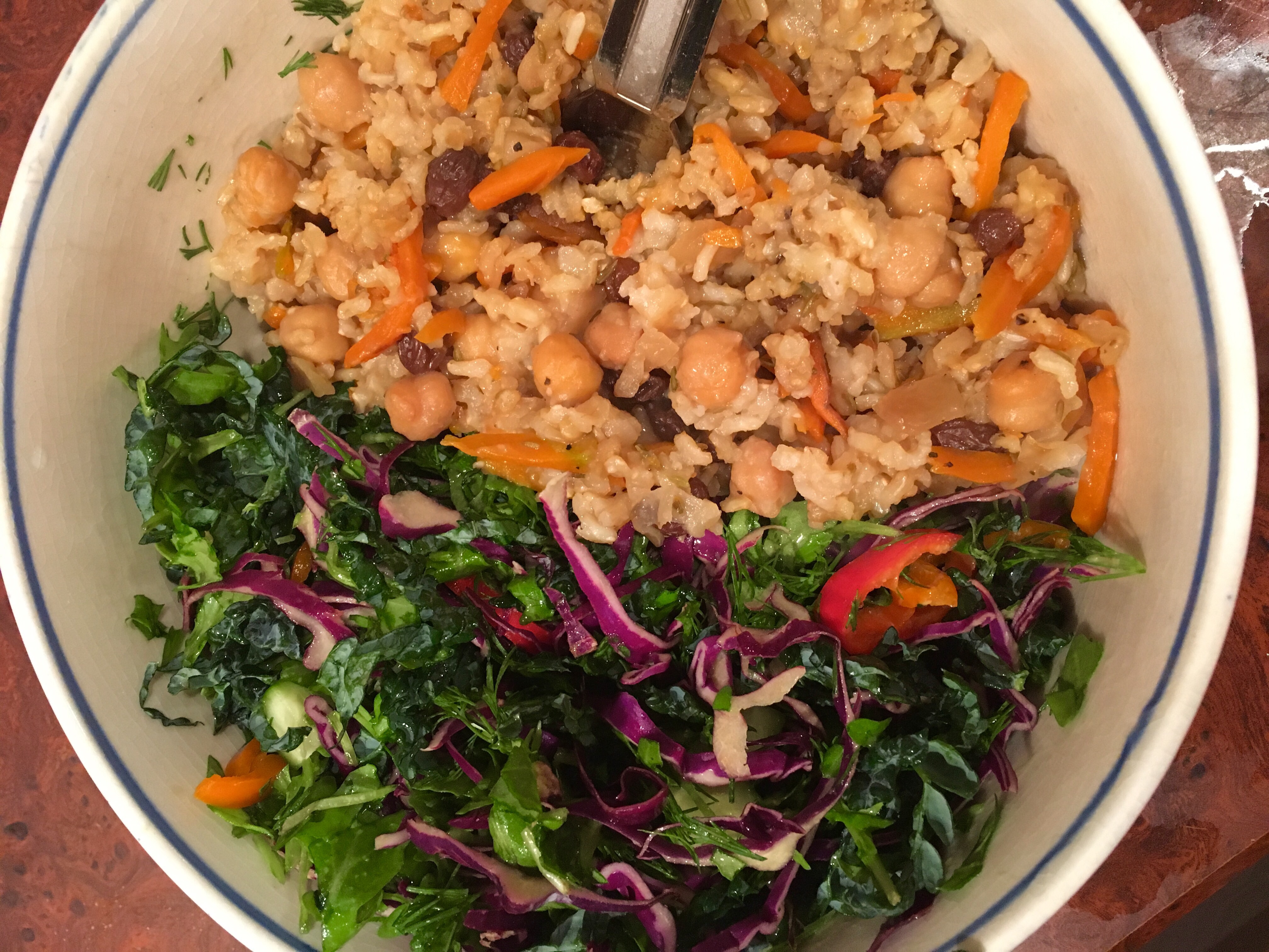 The pilaf is brown Texmati rice with onions ,chickpeas , carrots, raisins, garlic and seasoning , cumin seed, cumin, salt pepper, and onion powder . For the salad I chopped Dino Kale, arugula, purple cabbage , fresh dill, mini sweet peppers and fresh salad dressing consisting of maple syrup, Dijon mustard and apple cider vinegar . ( some themes I squeeze orange or lemon/lime in it).