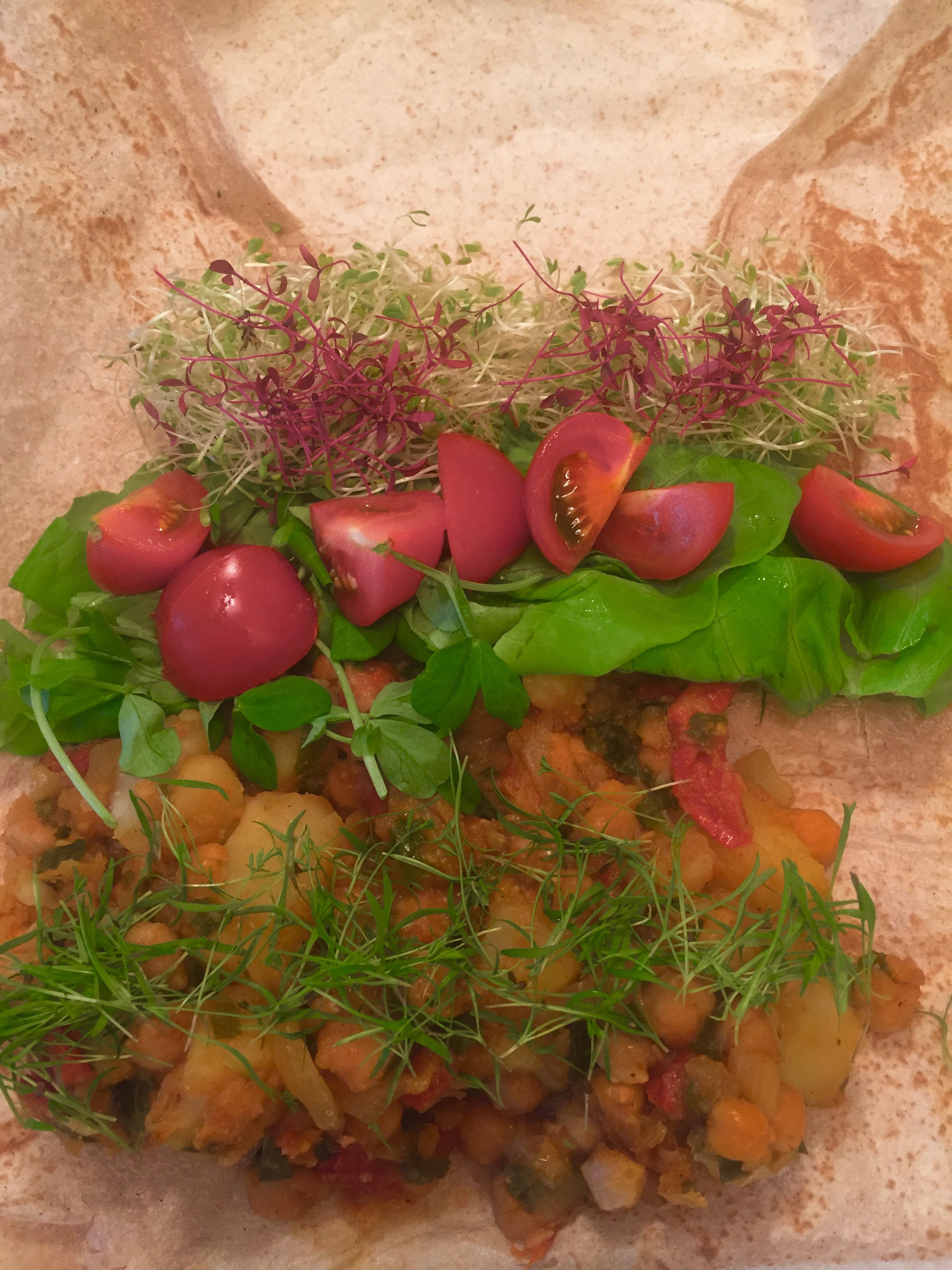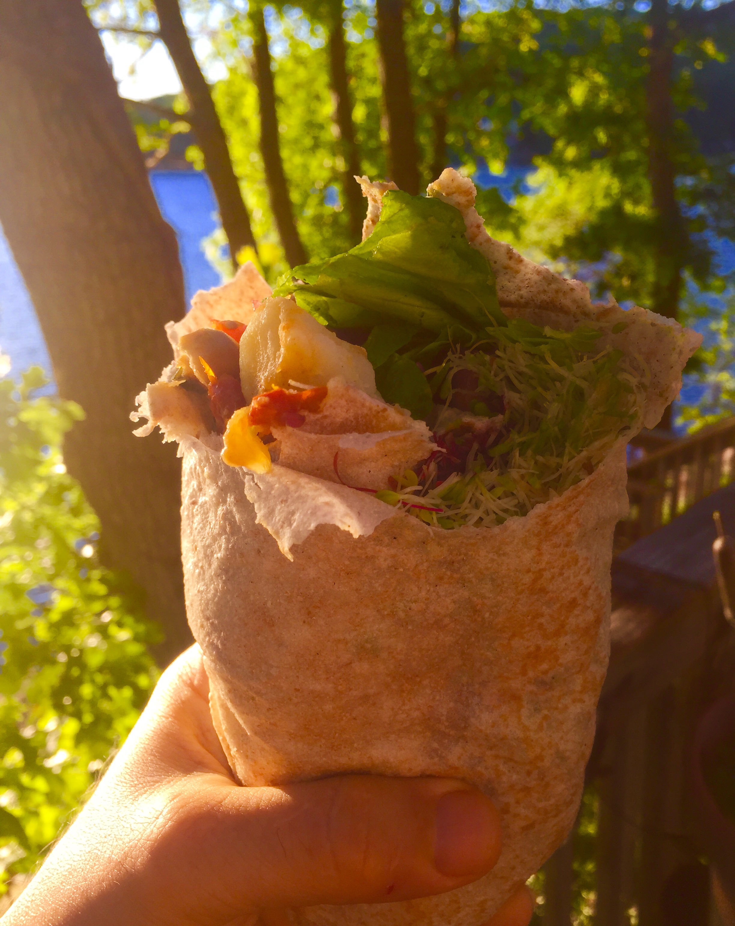Took my Indian inspired chick pea stew with onions sundried tomatos potato cilantro and a host of spices added micro greens from alfalfa sprouts, amaranth, sweet pea, carrot and bib lettuce and let us not forget home grown tomatoes. Roll and tuck with beautiful view to aid in digestion.