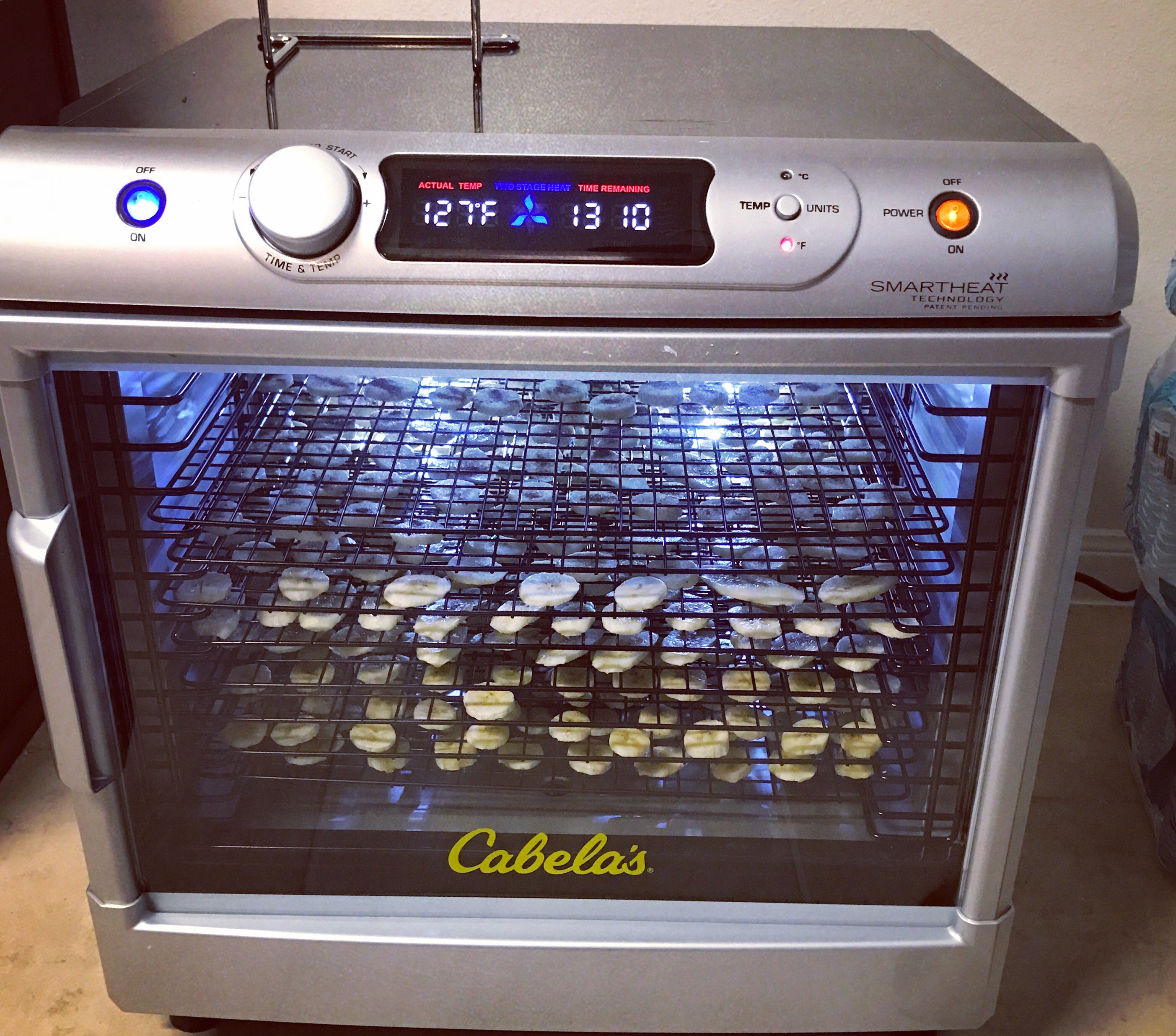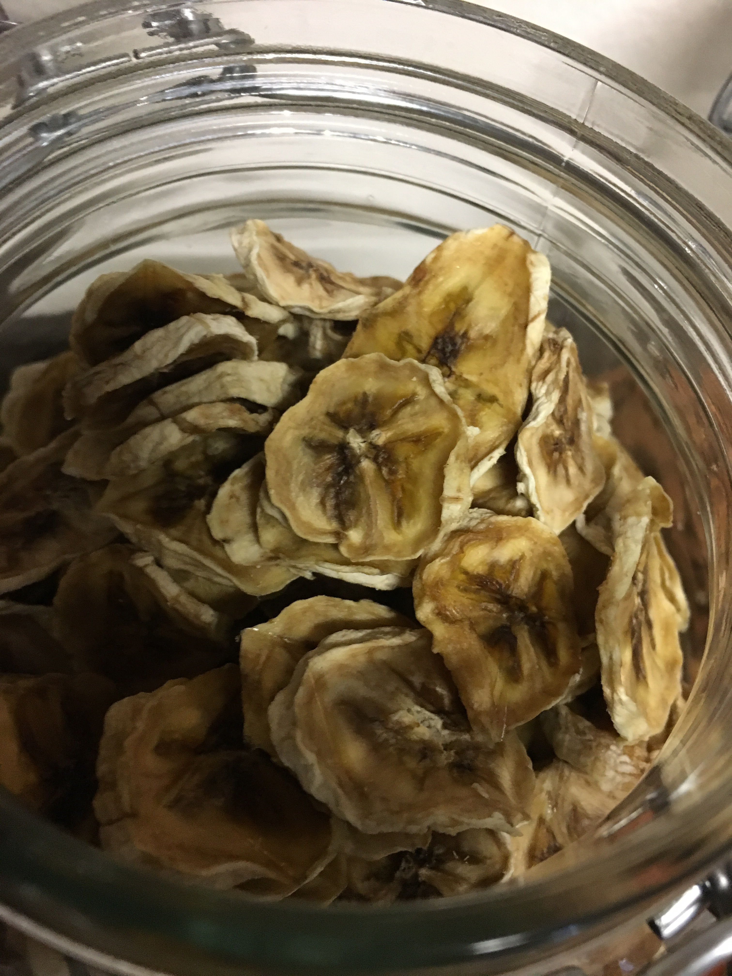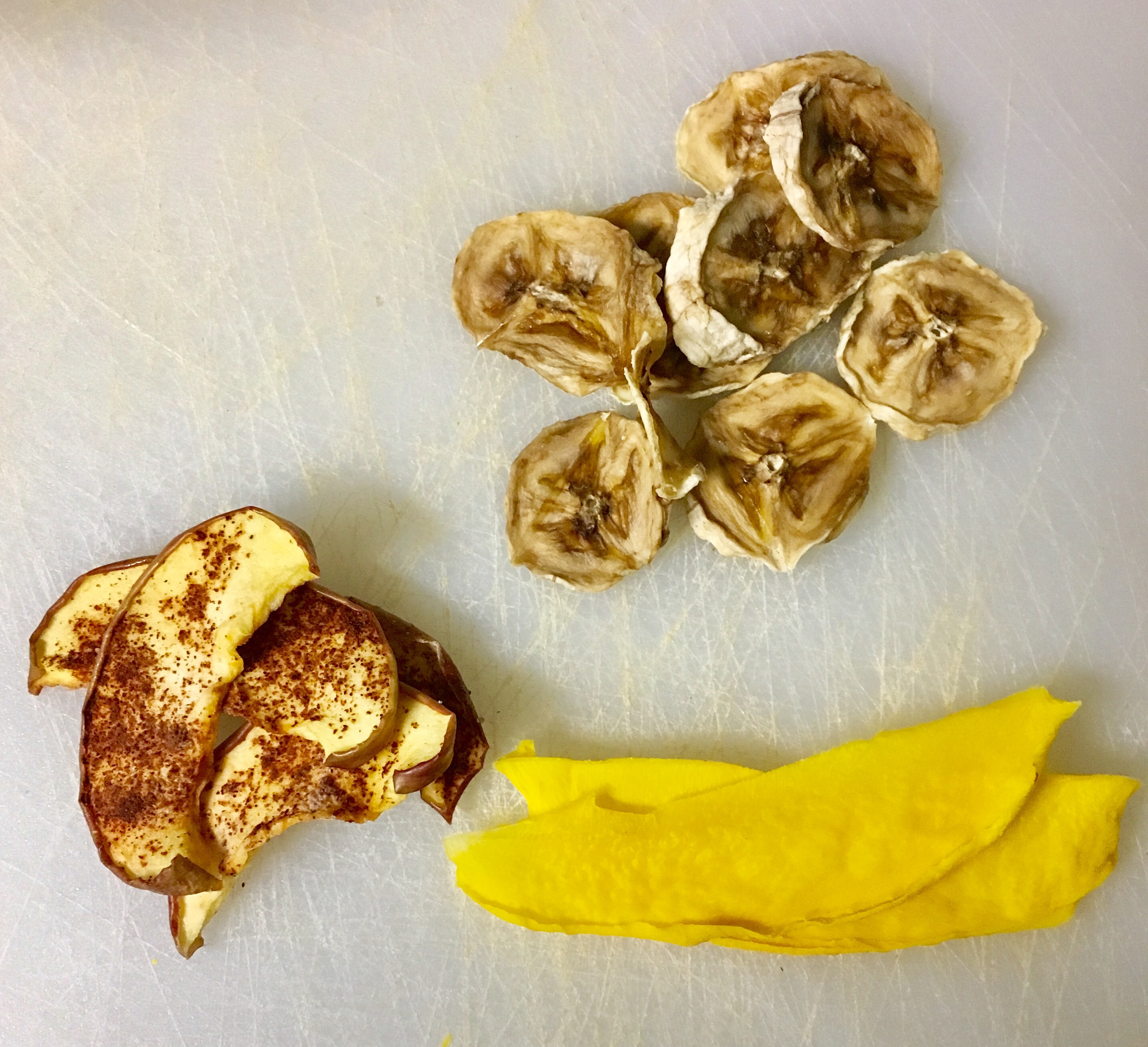 Have access to a serious cabelas dehydrator. This one can do some volume. So when bananas went on the reduced for quick sale for .39 cents a pound I was in. Then we added apples , mangoes, kiwi and pineapple. Key seems to be ripe fruit cut consistently. Great for road trips and cereal. I’ll try to add it to a homemade granola next.